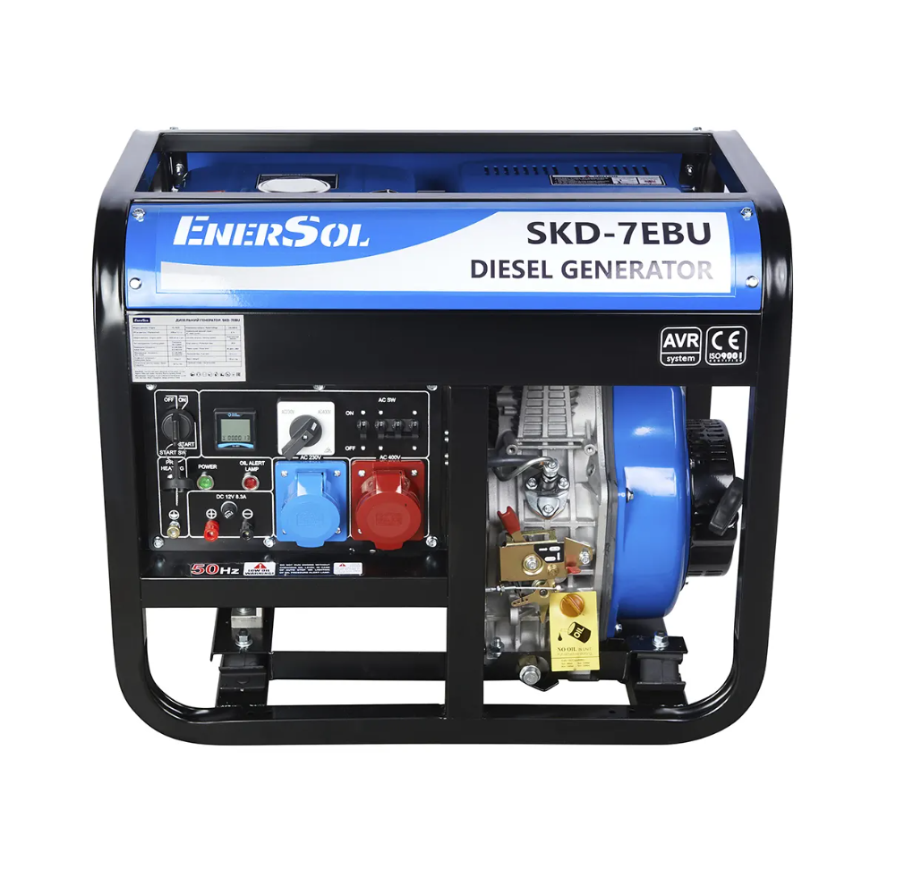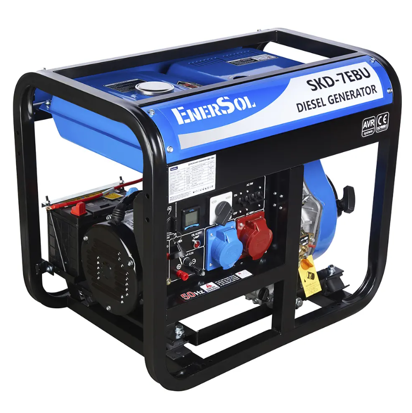Генератор дизельный EnerSol SKD-7EBU 6.0/6.5 кВт, трехфазный, с электрозапуском – трехфазная электростанция для обеспечения электроэнергией бытовых приборов, строительного оборудования и т.п. суммарной мощностью до 6,0 кВт (номинальная мощность). Максимальная мощность этого дизельного генератора – 6,5 кВт.