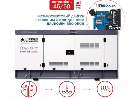 Дизельные 4-х цилиндровые электростанции серии HEAVY DUTY немецкой торговой марки Könner & Söhnen созданы на базе надежных двигателей французского бренда Baudouin с водяным охлаждением.