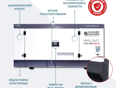 Высококачественныйшумозащитный корпус обеспечивает существенное снижение шума во время работы установки, имеет улучшенное термораспределение, защищает электростанцию от влаги и конденсата, от неблагоприятных погодных условий и несанкционированного вмешательства.