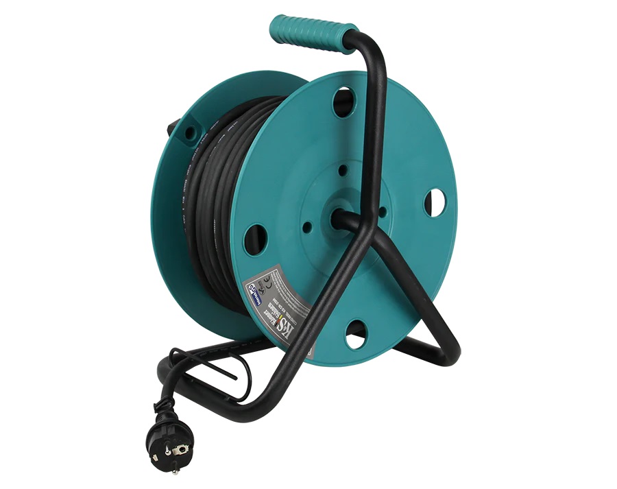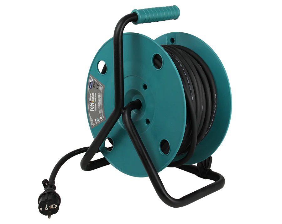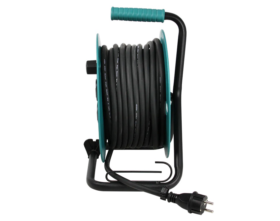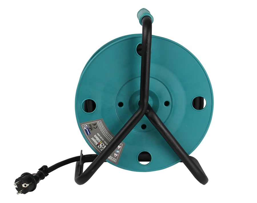 Катушка изготовлена из специального усиленного пластика, имеет прочную металлическую рамную конструкцию, устойчивую к повреждениям. Оснащена эргономичной резиновой ручкой для комфортного перемещения, фиксатором кабеля, креплением для регулировки направления кабеля, фиксатором для блокировки произвольной раскрутки катушки. Длина кабеля достигает 25 метров и подходит для удаленного подключения к 4-м электрическим приборам одновременно.