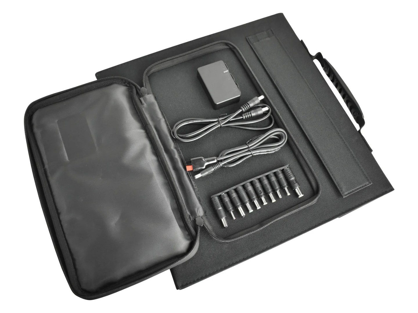 Чрезвычайно складывающаяся компактная конструкция удобно переносить одной рукой. Простота в использовании: складывается в легкую сумку и фиксируется пластиковыми фастексами, легко транспортируется с помощью ручки. Заряжаемые устройства можно легко поместить в карман на молнии, сохраняя их при этом в безопасности и чистоте. Возможность работы в частично разложенном состоянии позволяет использовать панель на ограниченном пространстве или при передвижении. На блоках предусмотрены дополнительные подставки для удобного размещения в развернутом виде.