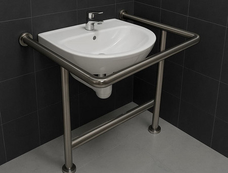 Поручень для раковины напольно-настенный с защитой слива INVO создан для обеспечения дополнительной безопасности и комфорта людей с ограниченными возможностями, инвалидов, пожилых и проходящих реабилитацию.