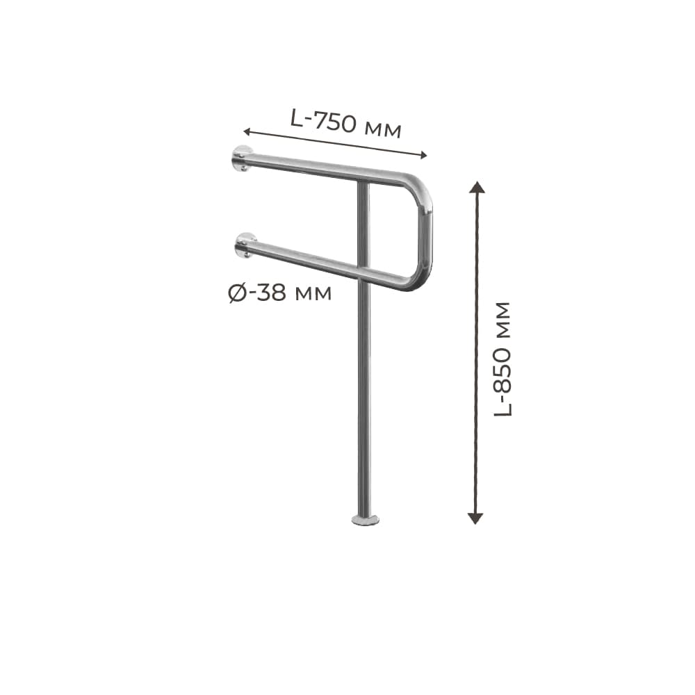 Описание Поручень для людей с инвалидностью (МГН) правый и левый напольный INVO для туалета с 2 опорами, на одной ножке, размер 750х850 мм, D трубы 38 мм