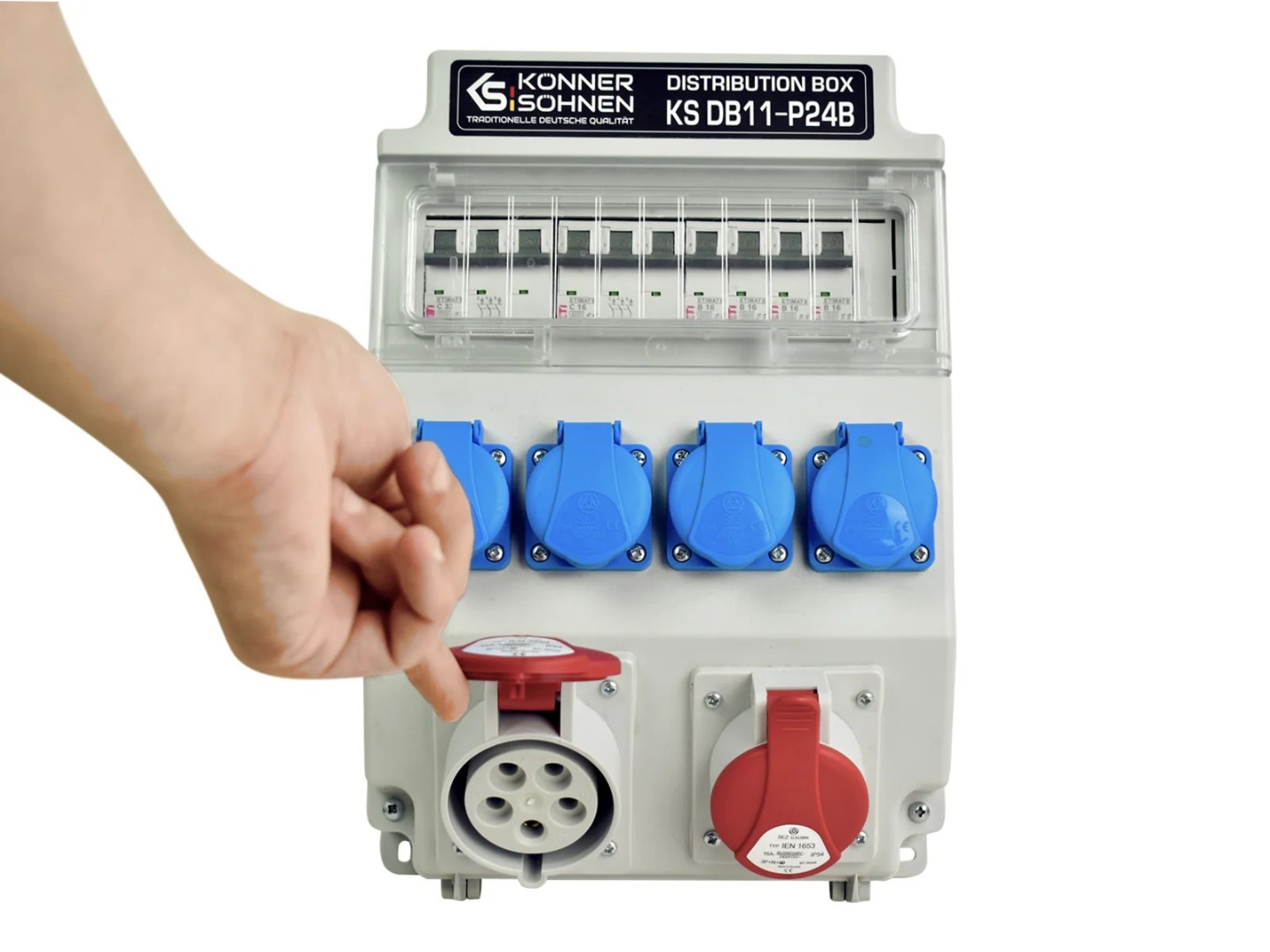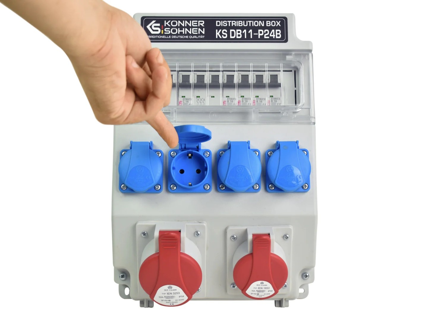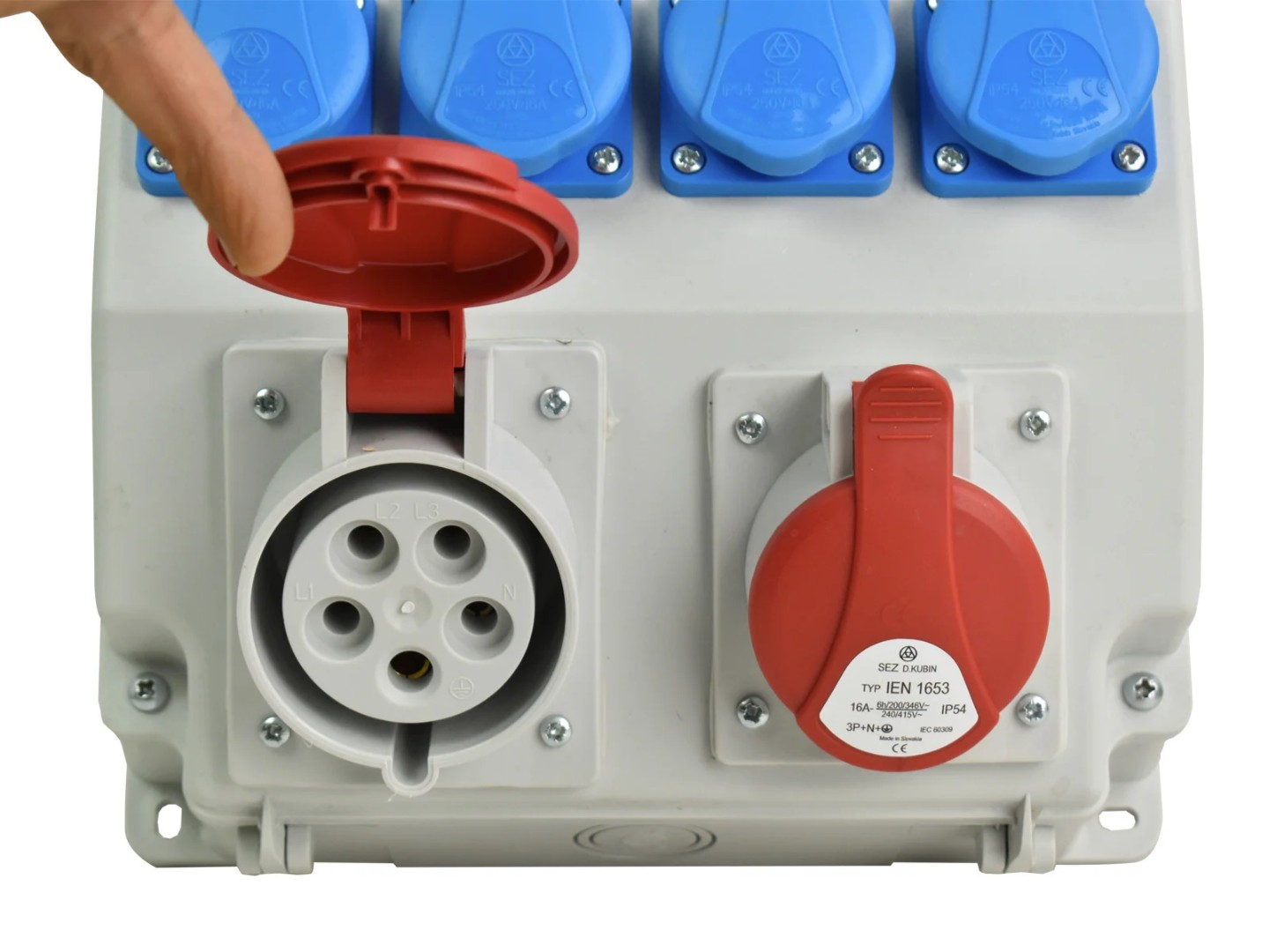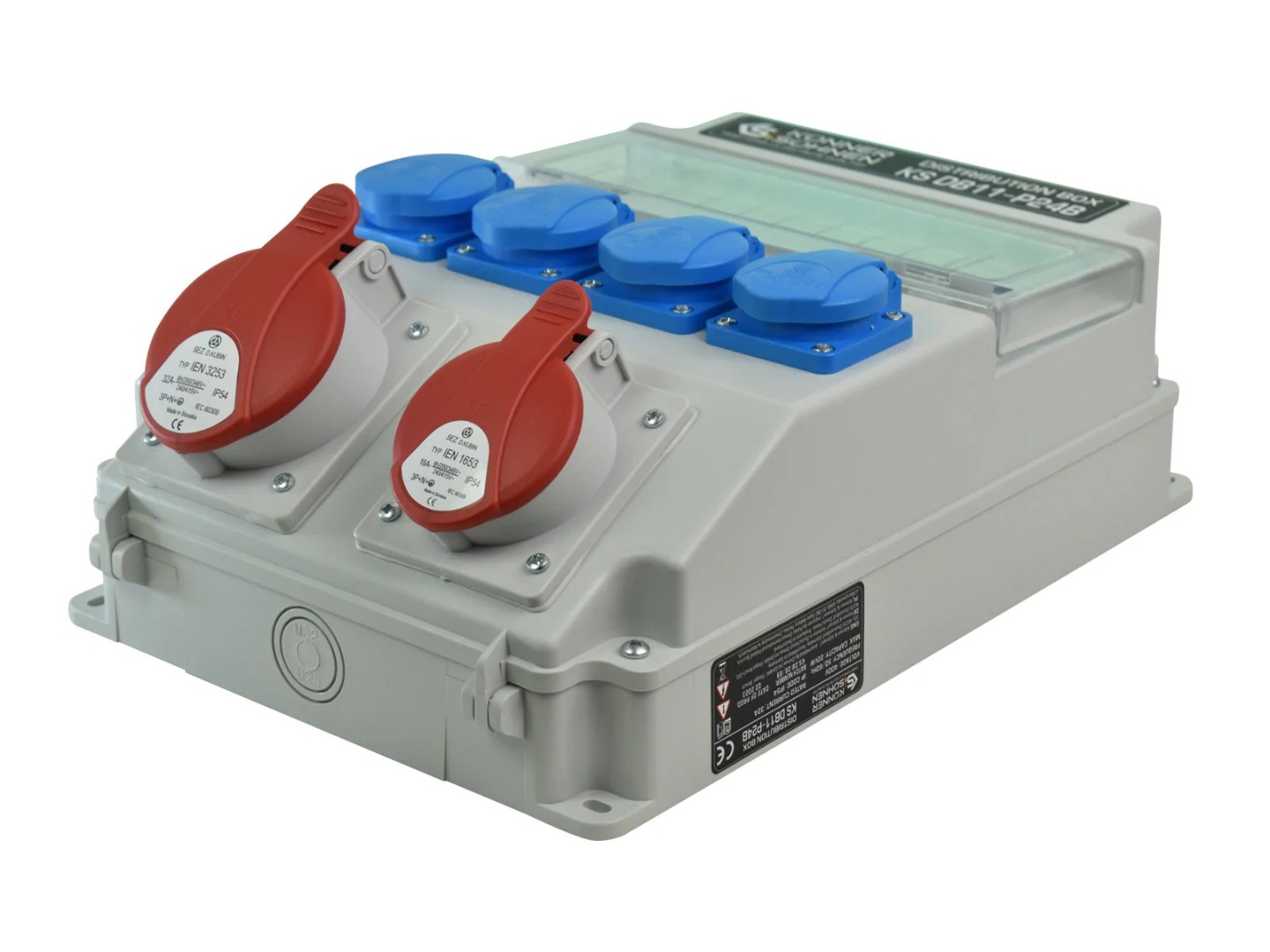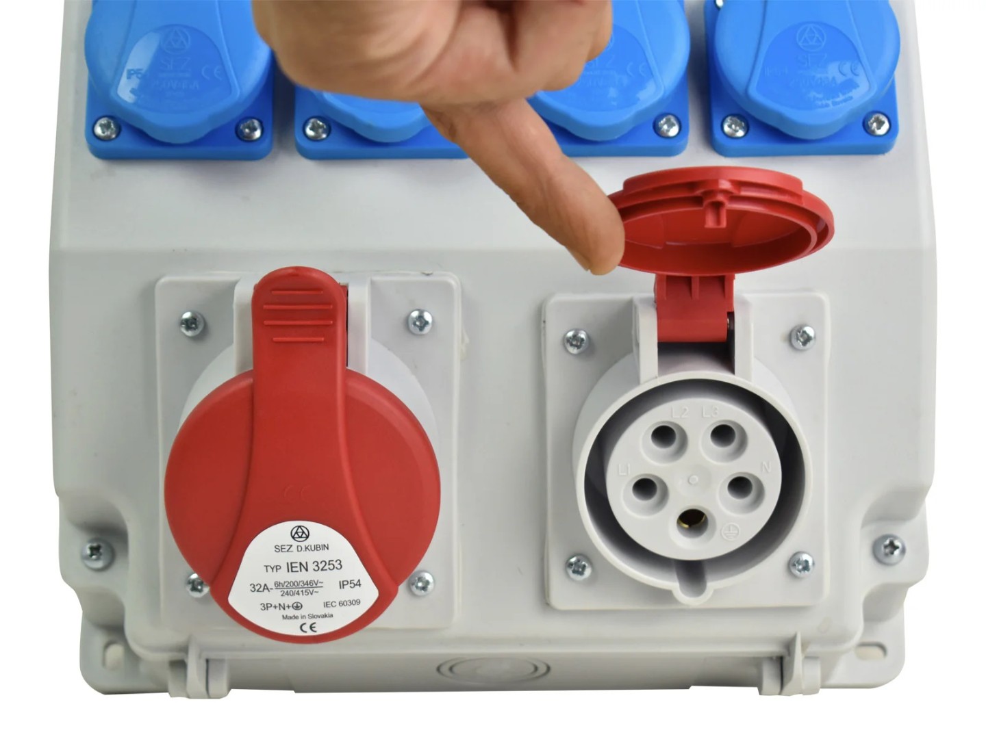- Розетки 1 x CEE 400 V 32 A, 4 x Schuko 230 V, 1 x CEE 400 V 16 A
