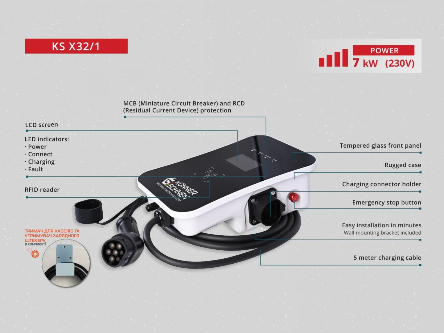 Станция для зарядки электромобилей KS X32/1 – это удобный и надежный способ зарядки электромобиля. Зарядка проходит быстрее и безопаснее. Зарядная станция имеет встроенную защиту от перегрузки, а также от утечки тока при нарушении изоляции и прямом прикосновении к одной из токоведущих частей.