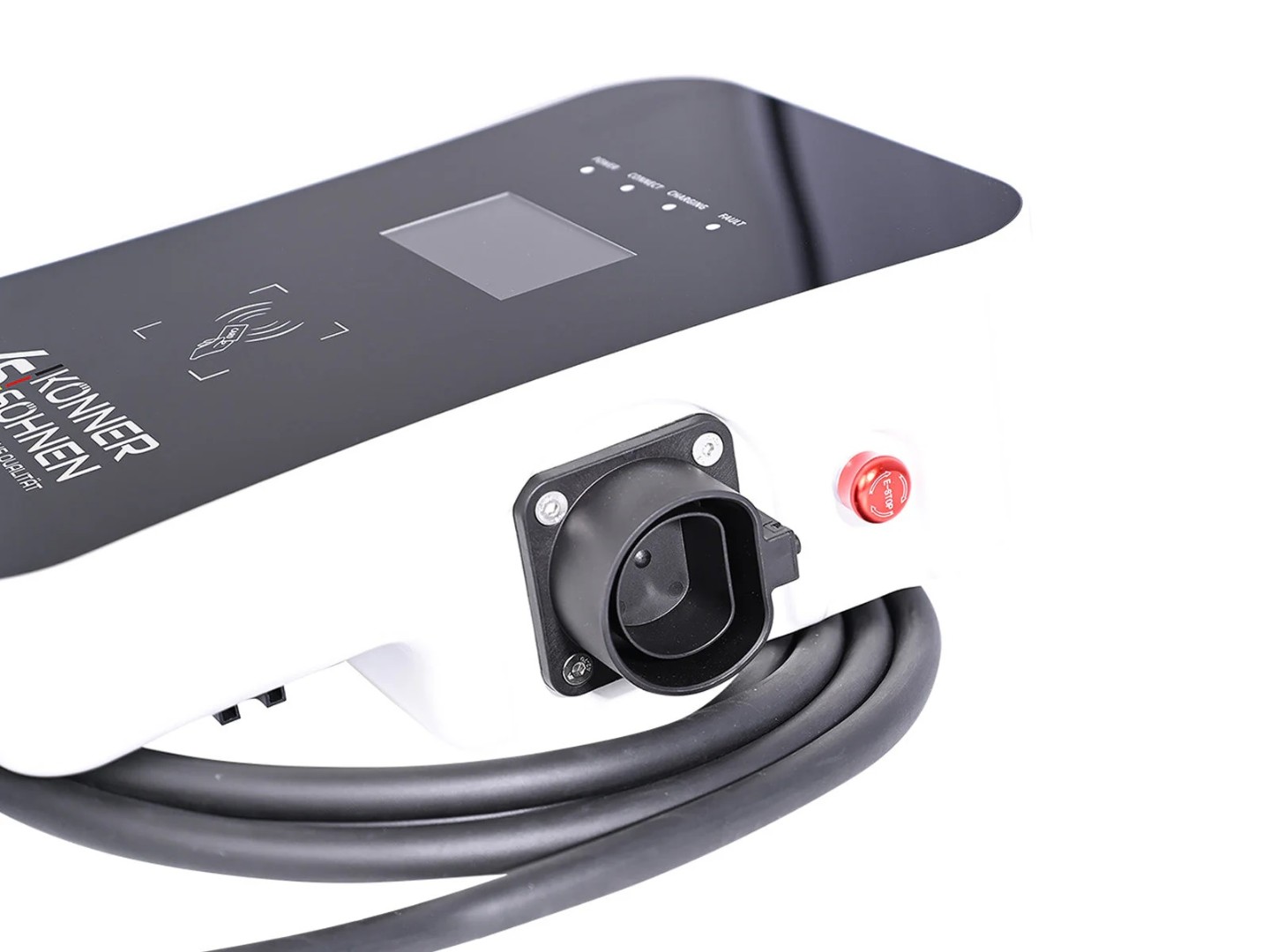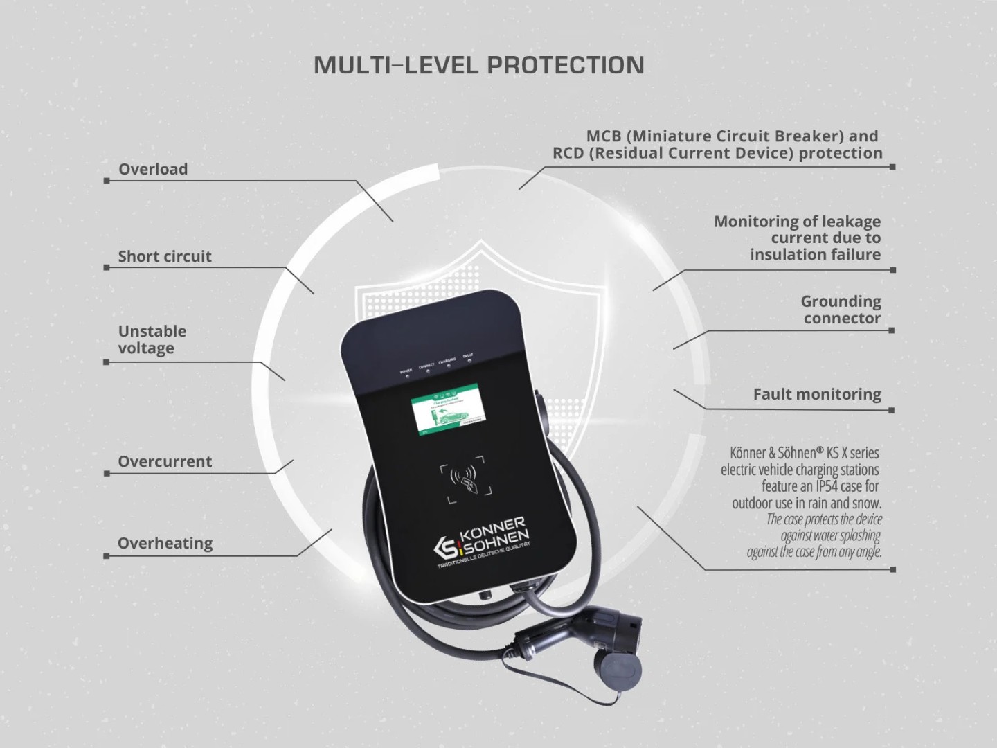 Станции для зарядки электромобилей серии KS X от Könner & Söhnen® изготовлены в корпусе с классом защиты IP54, что позволяет использовать их на улице и в дождь и в снег. Корпус защищает от попадания внутрь оболочки брызг, падающих под любой углом. 4.3-дюймовый LCD-дисплей отображает важную информацию, а светодиодные индикаторы информируют о состоянии зарядки. Прочный корпус из высококачественных материалов и передняя панель из закаленного стекла.