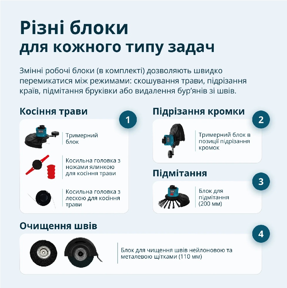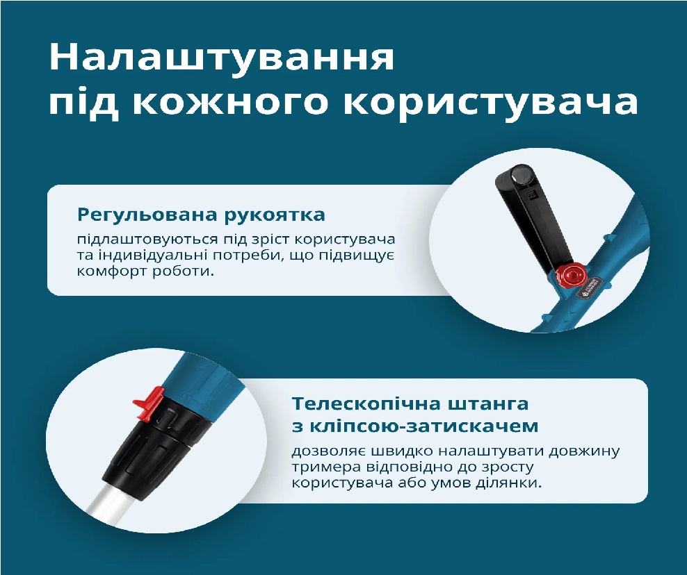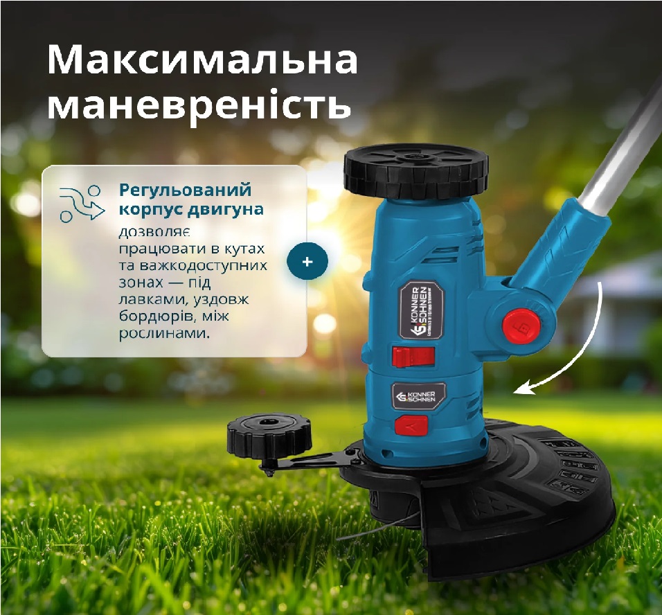 Встроенный отсек для сменных ножей в рукоятке делает их замену быстрой и простой, без необходимости носить отдельный контейнер. Регулируемая поворотная рукоятка позволяет изменять угол наклона для удобного удержания и лучшего контроля при работе. Благодаря этому инструмент легко адаптируется к различным задачам и предпочтениям пользователя. Рукоятка с резиновым покрытием обеспечивает комфортный хват, предотвращает скольжение и снижает нагрузку на руки во время длительного использования. Это особенно полезно при работе на больших участках. Регулируемый корпус двигателя двигатель можно перемещать по штанге и изменять угол его наклона, что позволяет работать в труднодоступных местах, например, под скамейками, кустарниками или вдоль бордюров. движения во время работы.Характеристики - Триммер аккумуляторный многофункциональный KS MFT-20V