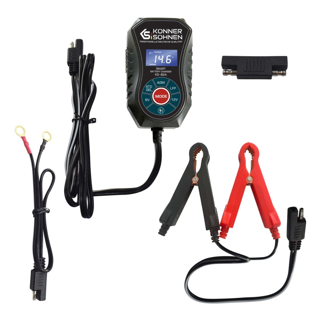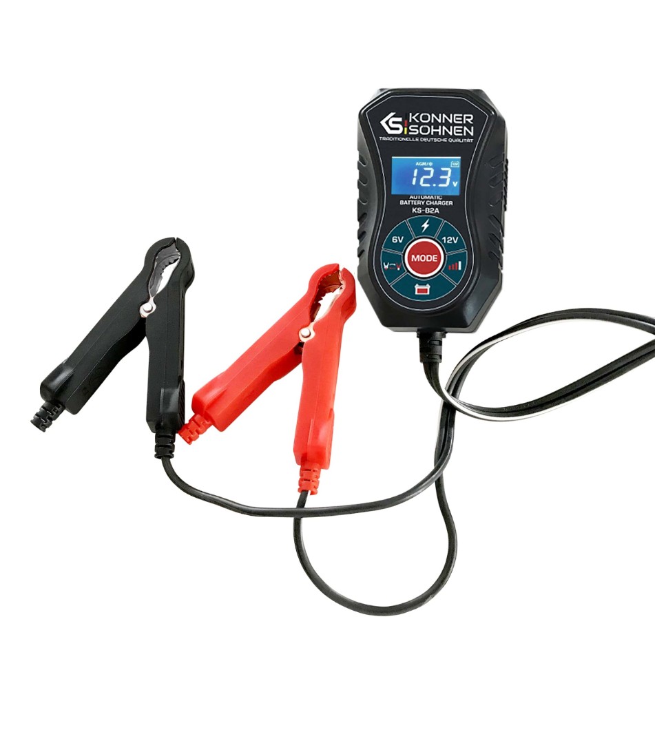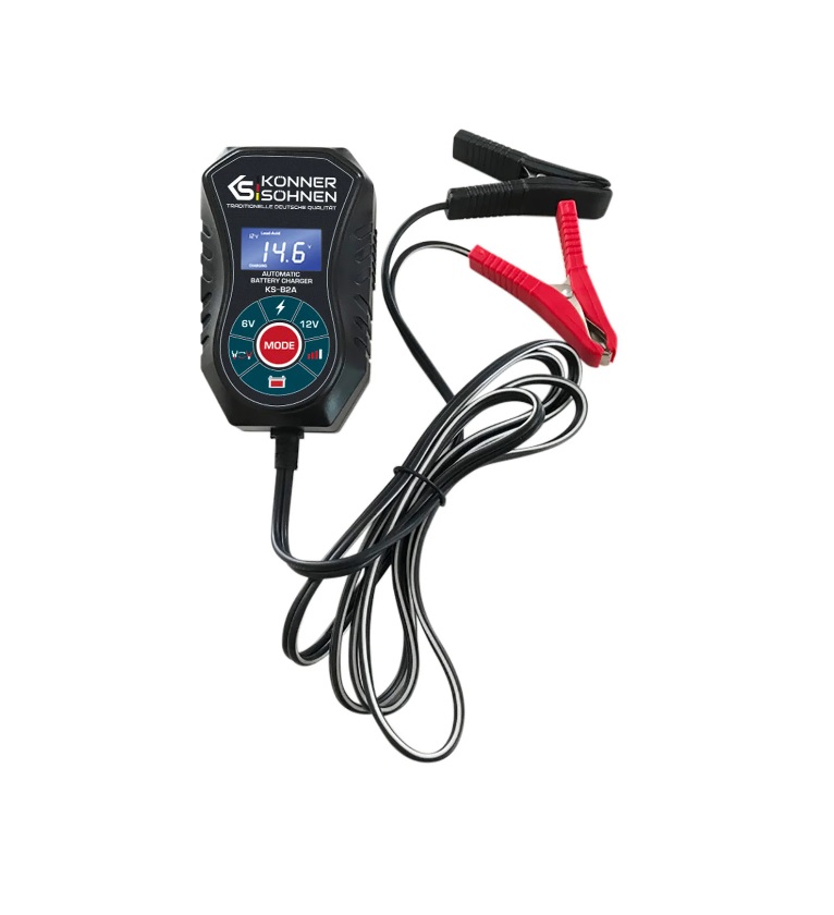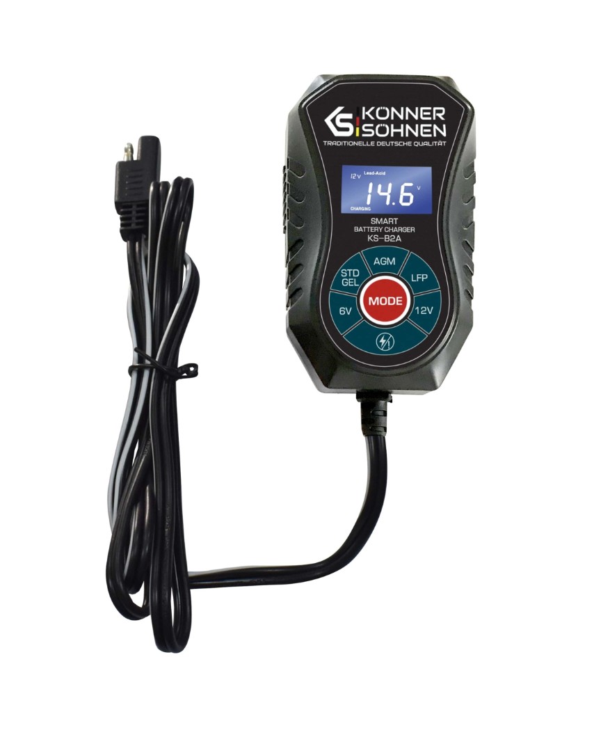 Простое в использовании компактное зарядное устройство KS-B2A немецкой ТМ Könner & Söhnen® имеет три режима работы и предназначен для зарядки LiFePo4, AGM и свинцово-кислотных (Lead-acid) и гелевых аккумуляторных батарей с напряжением 6 В и 12 В, а также аккумуляторов LiFePo4 с номинальным напряжением 12,8. Такие аккумуляторы используются в автомобилях, легких грузовиках, тракторах, генераторах, фургонах, мобильных домах, моторных лодках и т.д. емкостью до 45 А·ч.