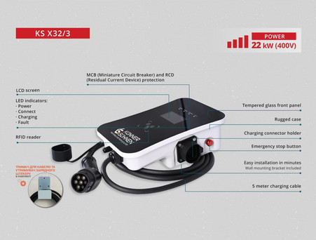 Станція для зарядки електромобілів KS X32/3 – це зручний та надійний спосіб зарядки електромобіля. Заряджання проходить швидше та безпечніше. Зарядна станція має вбудований захист від перенавантаження а також від витоку струму у разі порушення ізоляції та прямому дотику до однієї із струмовідних частин.